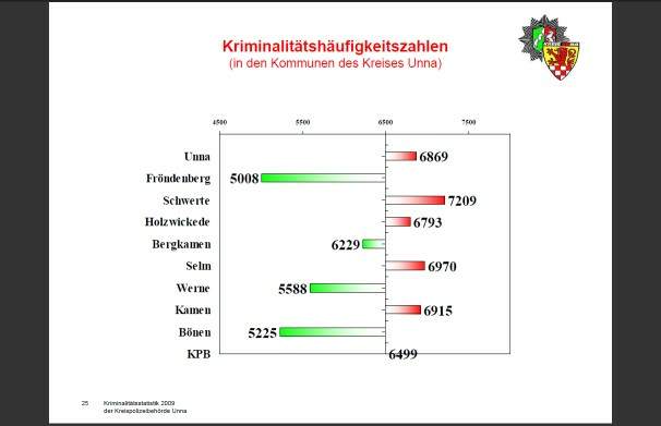 Hier die Grafik "Kriminalitätshäufigkeitszahlen" (= Straftaten pro 100.000 Einwohner) für das Jahr 2009 im Kreis Unna: